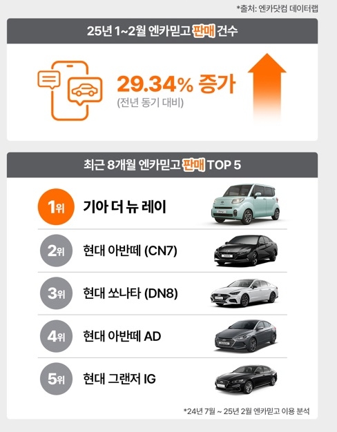 실제 지난해 7월부터 올해 2월까지 8개월간 일반 딜러 매물 중 엔카가 직접 진단하고 확인한 차를 온라인으로 신청해 배송받을 수 있는 ‘엔카믿고’ 서비스를 통해 가장 많이 판매된 모델은 기아 경차 ‘더 뉴 레이’로 집계됐다.