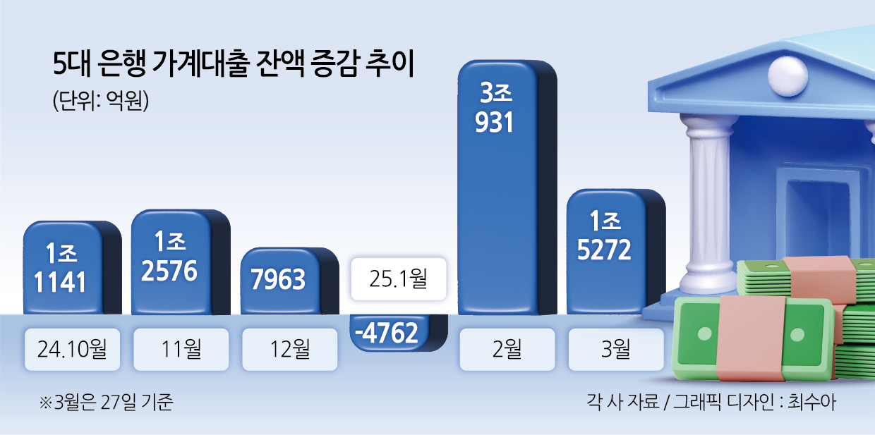 2월 한 달간 가계대출이 3조931억원 폭증했던 것과 비교해선 급감했지만 지난해 4분기 가계대출 증가액이 월 1조원 안팎이었다는 점을 고려하면 적지 않은 수준이다. 올해 1월에는 이들 은행의 가계대출 잔액이 5000억원가량 줄어든 바 있다.