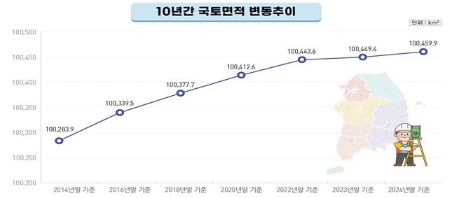 [헤럴드경제=신혜원 기자] 지난해 우리나라 전체 국토면적이 전년 대비 10.5㎢ 증가한 것으로 나타났다. 이는 인천시 경제자유구역 공구 매립준공, 전남 남악 오룡지구 택지개발 사업 등 토지개발사업이 진행됨에 따라 늘어난 것으로 풀이된다.