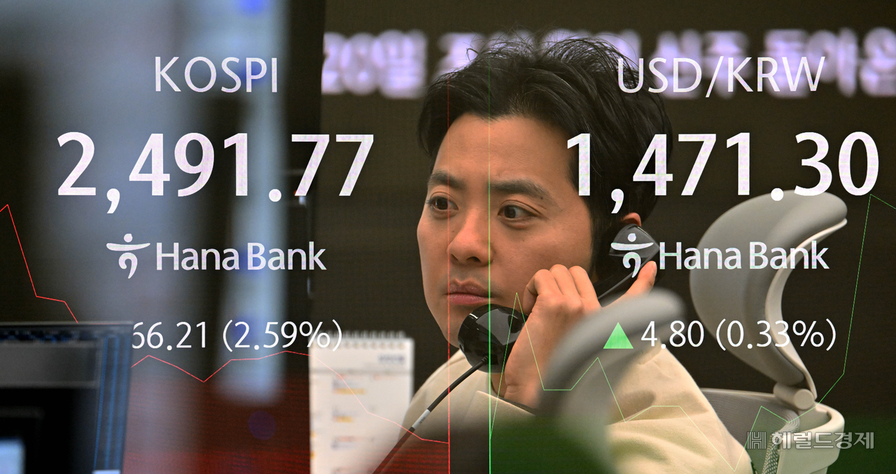 [헤럴드pic] 공매도 재개 첫날, 하락하는 증시 글꼴 선택 본문 텍스트 크게본문 텍스트 작게 인쇄 [헤럴드경제=임세준 기자] 코스피가 공매도 재개 첫날인 31일 장 초반 단숨에 2,490대로 밀려났다. 지수는 전장 대비 44.54포인트(1.74%) 내린 2,513.44로 출발한 후 낙폭이 커지고 있다. 31일 오전 서울 중구 하나은행 딜링룸 전광판에 9시 18분 기준 코스피 지수가 66.21포인트 하락한 2491.77포인트, 원달러 환율이 4.80원 상승한 1471.30원을 나타내고 있다. 사진은 다출노출 합성.