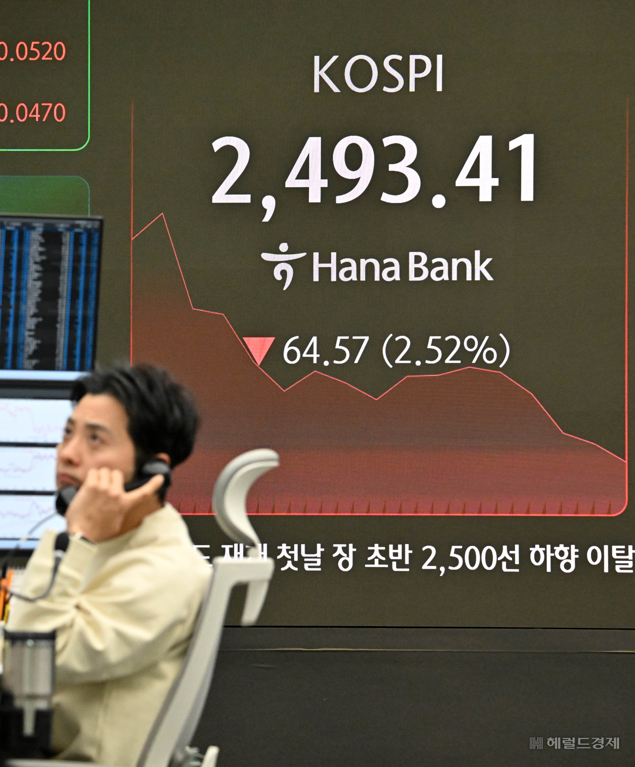 [헤럴드pic] 2500선 깨진 코스피 글꼴 선택 본문 텍스트 크게본문 텍스트 작게 인쇄 [헤럴드경제=임세준 기자] 코스피가 공매도 재개 첫날인 31일 장 초반 단숨에 2,490대로 밀려났다. 지수는 전장 대비 44.54포인트(1.74%) 내린 2,513.44로 출발한 후 낙폭이 커지고 있다. 31일 오전 서울 중구 하나은행 딜링룸 전광판에 9시 17분 기준 코스피 지수가 64.57포인트 하락한 2493.41포인트를 나타내고 있다.