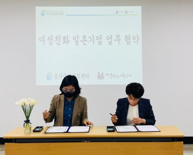 | 2025년 여성친화기업 환경개선 지원사업을 수행하고 있는 울산중부새로일하기센터가 여성친화 일촌기업 업무협약을 맺고 있는 모습 [울산중부새로일하기센터 제공] |