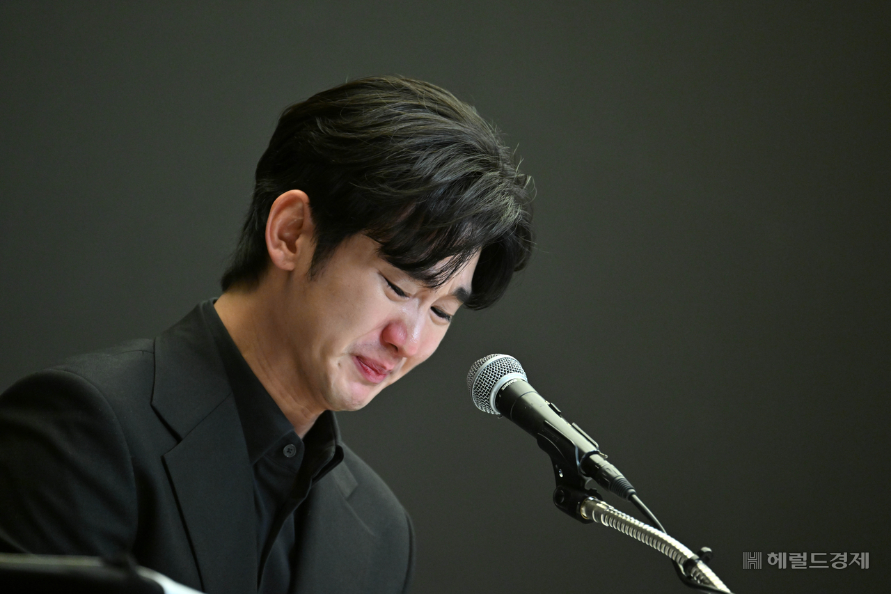 | 고 김새론 배우와 미성년자 시절 교제했다는 의혹을 받는 배우 김수현이 31일 오후 서울 마포구 스탠포드 호텔에서 기자회견 중 눈물을 흘리고 있다. 김수현은 그간 김새론과의 교제 의혹에 대해 부인했으나, 입장을 번복하고 김새론이 성인이 된 이후부터 1년간 교제했다고 주장했다. 하지만 김새론 유족 측은 고인이 미성년자 시기 김수현과 교제한 증거로 2016년 두 사람의 카카오톡 대화를 공개하며 논란이 이어지고 있다. [사진=임세준 기자/jun@] |