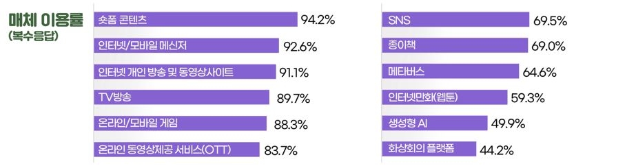 조사 결과에 따르면 최근 1년 동안 청소년들의 이용률이 가장 높은 매체는 ‘숏폼’(94.2%)으로, 모든 학교급에서 상위 순위를 차지했다. 그 뒤로는 ▷인터넷·모바일 메신저(92.6%) ▷인터넷 개인방송 및 동영상 사이트(91.1%) ▷TV방송(89.7%) ▷온라인·모바일 게임 (88.3%) 등의 순으로 높은 이용률을 보였다.