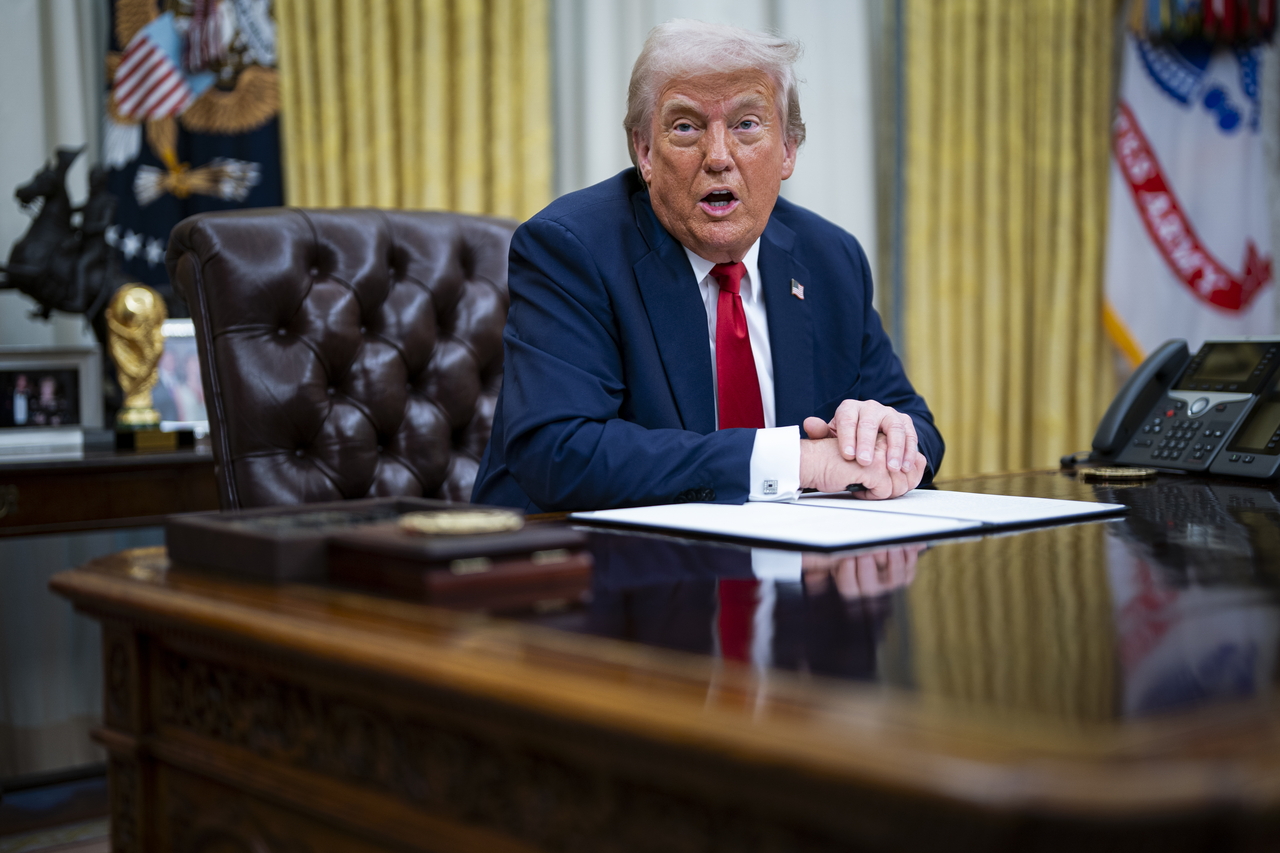 | 도널드 트럼프 미국 대통령이 31일(현지시간) 백악관 집무실에서 행정명령에 서명한 뒤 취재진과 이야기하고 있다. [EPA] |