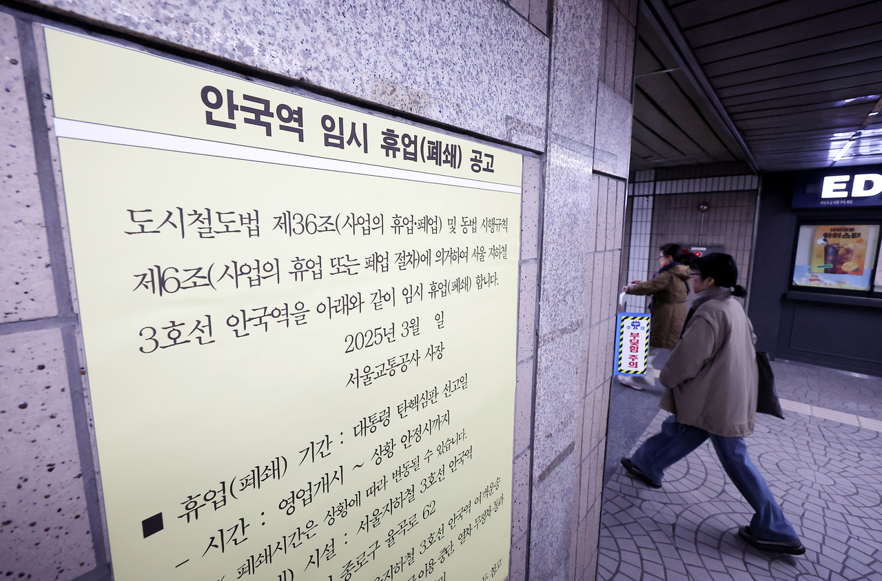 이와 함께 윤 대통령의 탄핵심판 선고 당일에는 첫 차부터 안국역을 폐쇄한 뒤 무정차 운행할 예정이다. 또 인근 광화문과 경복궁, 종로3가, 종각, 시청, 한강진역 역시 역장 판단에 따라 무정차 통과시키기로 했다.