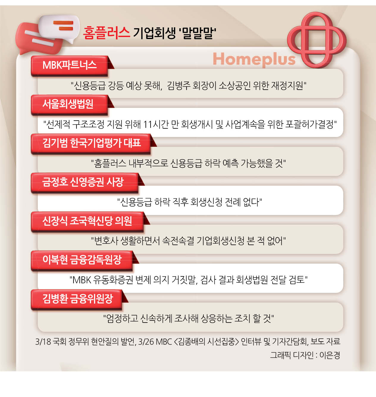 법원이 회생을 허가하는 사이 MBK의 홈플러스 정상화를 위한 ‘자구 노력’의 흔적이 전무한 점도 부각된다. 오히려 MBK는 도덕적 해이 논란의 중심에 섰다. 홈플러스의 법정관리 3영업일 전까지 자본시장에서 자금을 마련했다.