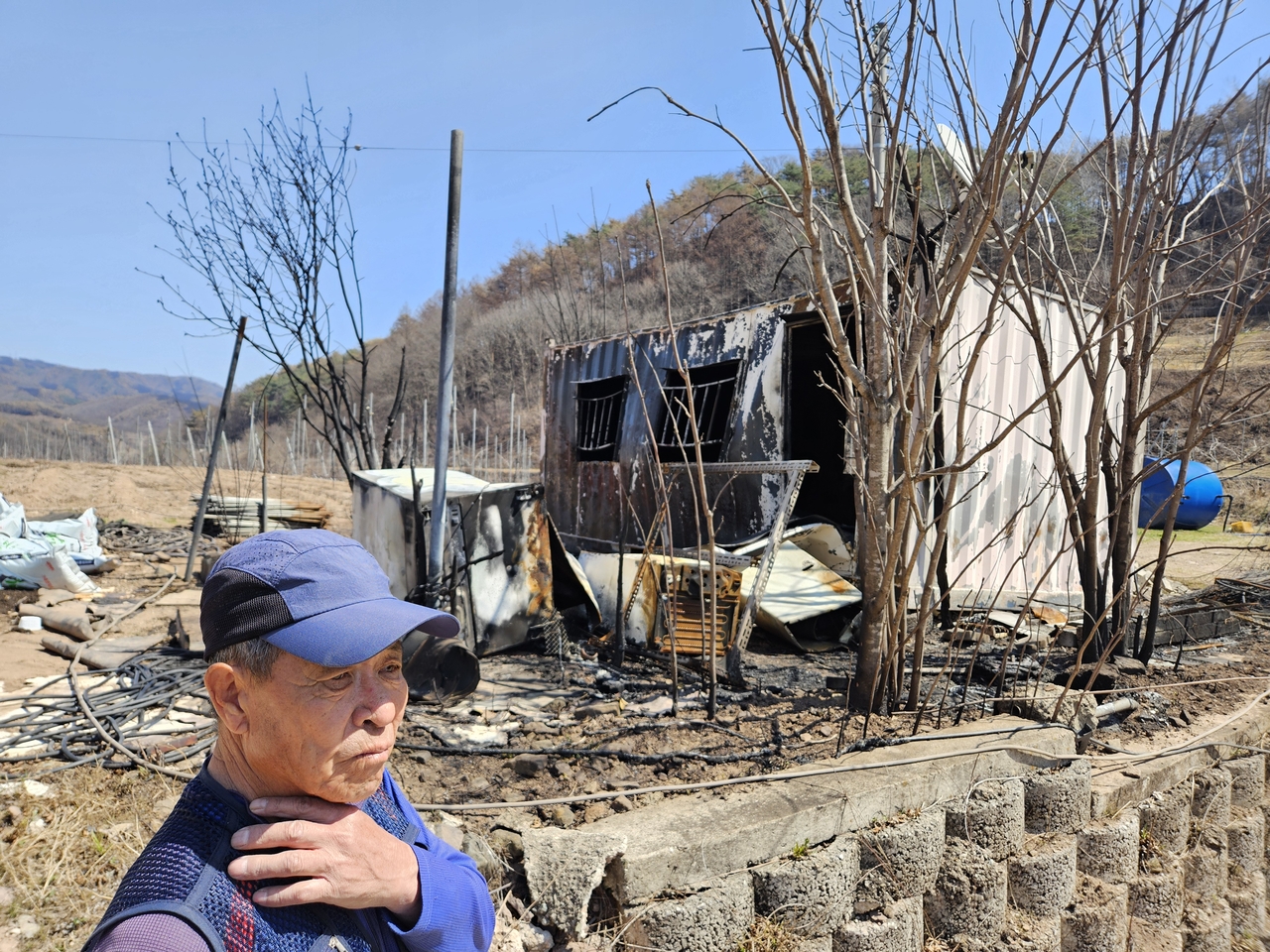 이씨는 그러면서 불길이 번질 당시 밭에서 나무를 지키려 했던 당시 상황도 회상했다. 그는 “물 뿌리던 고무호스가 녹아버릴 정도로 열기가 뜨거웠다”며 “산이 서서히 불탄 게 아니라 한 순간에 산 전체가 확 불 탔다”고 했다. 이씨도 결국 산불이 거세지자 현장에서 대피했다고 했다.