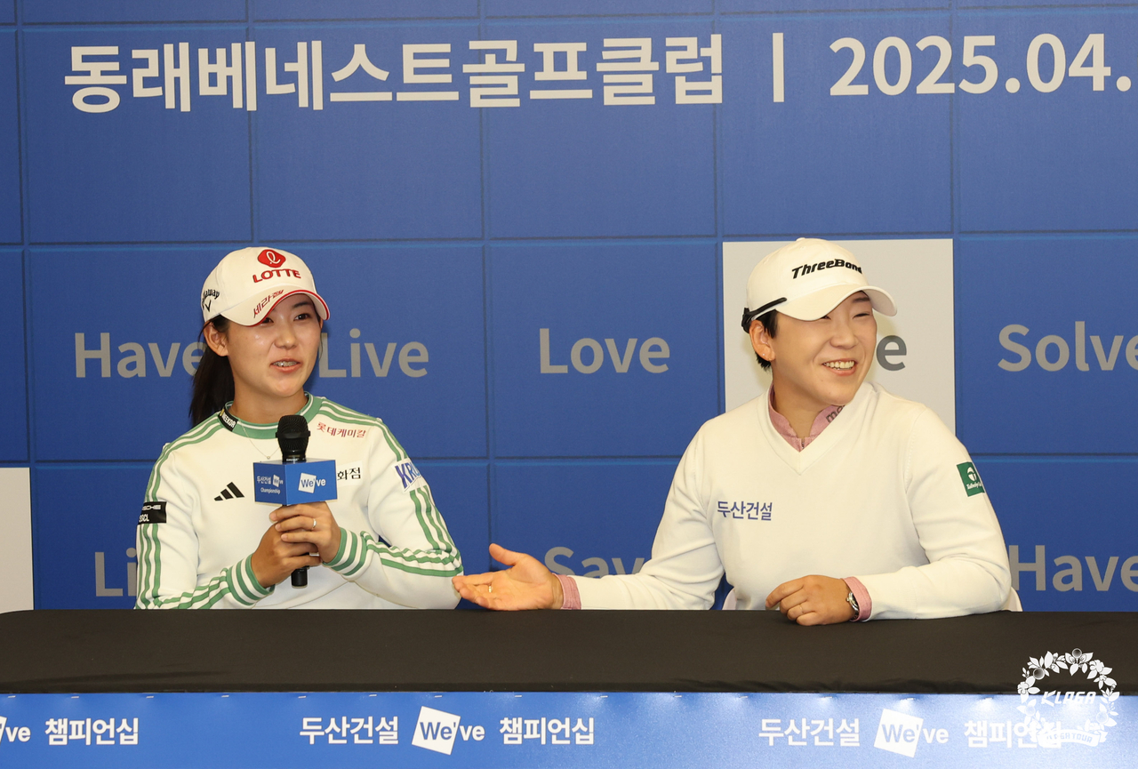 | 대회 개막 하루 전 열린 공식 기자회견에 참석한 신지애(오른쪽)와 황유민. [사진=KLPGA] |