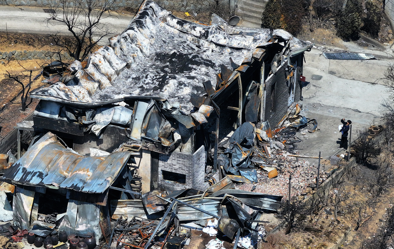 | 지난 1일 경북 영덕군 영덕읍 석리 한 마을이 산불로 쑥대밭이 된 가운데 한국LPG사업관리원 관계자가 피해 상황을 조사하고 있다. [연합뉴스] |