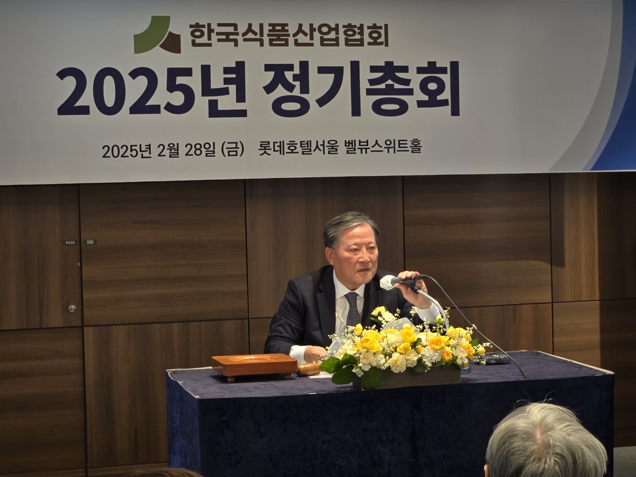 | 28일 서울 중구 롯데호텔에서 열린 한국식품산업협회 정기총회에서 이효율 회장이 발언 중이다. 정석준 기자 |