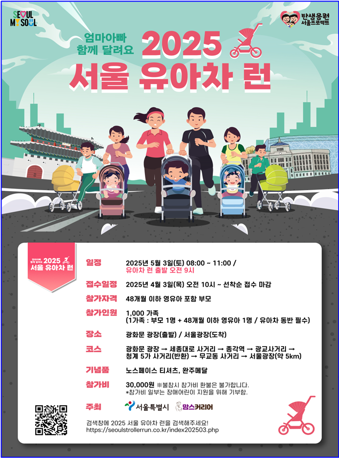 서울시는 가정의 달 5월을 맞아 내달 3일 ‘2025 서울 유아차 런(Run)’을 처음으로 개최한다고 밝혔다.