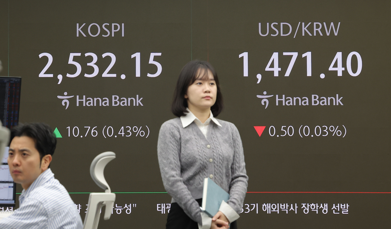 | 2일 오전 서울 중구 하나은행 본점 딜링룸에서 딜러가 업무를 보고 있다. 이날 코스피는 전날보다 4.23p(0.17%) 오른 2,525.62으로 시작했다. 원/달러 환율은 0.4원 내린 1,471.5원으로, 코스닥은 3.92p(0.57%) 오른 695.37로 개장했다. [연합] |