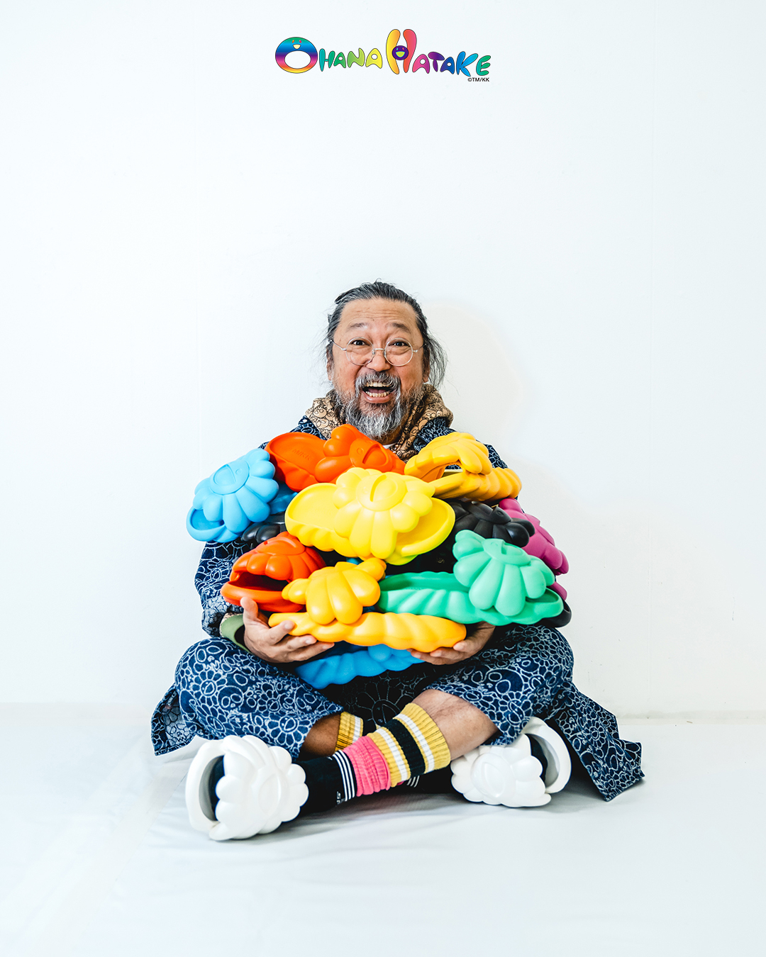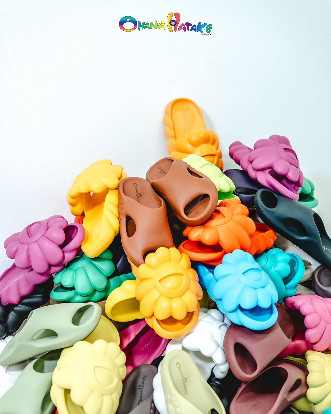 무라카미 다카시의 풋웨어 브랜드 ‘오하나 하타케’는 일본어로 ‘꽃밭’을 의미한다. 대표 제품 ‘오하나 풀블룸’에는 웃는 꽃 모양이 중앙에 크게 자리하고 있다. 푹신하고 충격 흡수력이 좋은 EVA 소재로 제작됐다.