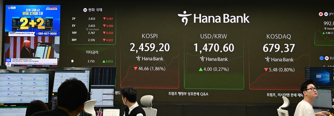 | 도널드 트럼프 미 행정부가 한국에 25%의 상호관세 세율을 적용한 3일 오전 서울 중구 하나은행 본점 딜링룸에서 딜러가 업무를 보고 있다. 이날 코스피는 전날보다 68.43p(2.73%) 내린 2,437.43으로 시작했다. 원/달러 환율은 4.4원 오른 1,471.0원으로, 코스닥은 14.10p(2.06%) 내린 670.75로 개장했다. 이상섭 기자 |