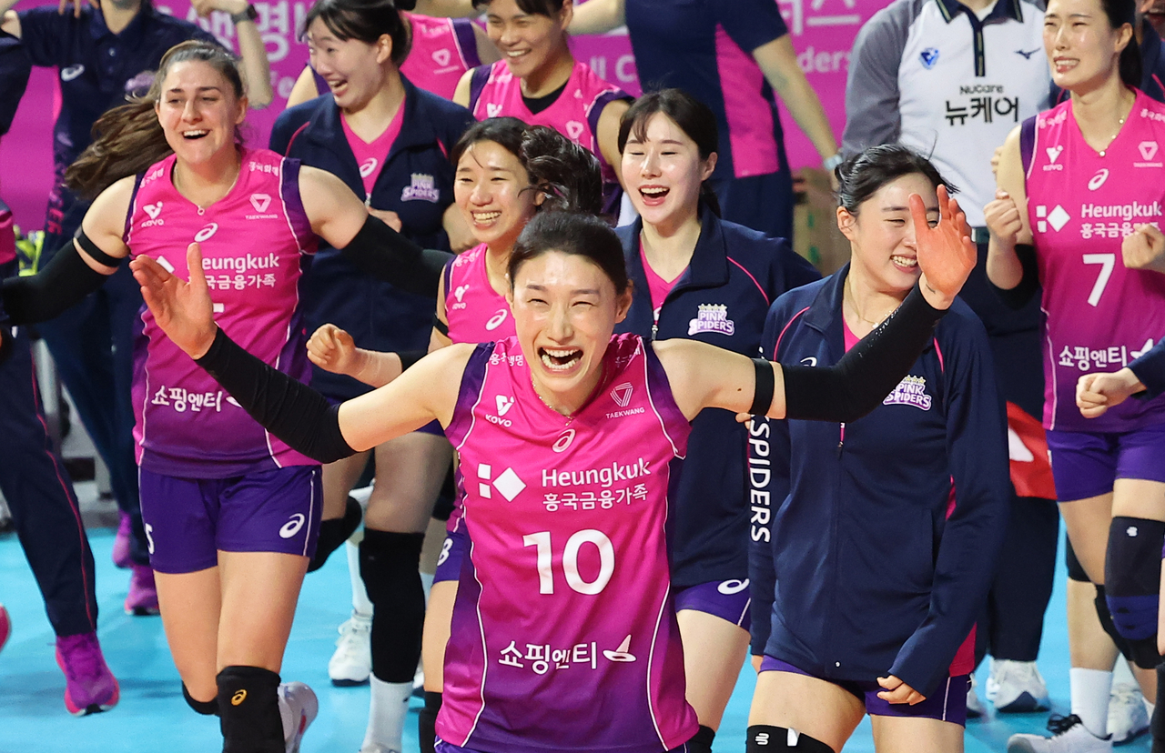 | 김연경과 흥국생명 선수들이 2일 인천 삼산월드체육관에서 열린 프로배구 V리그 여자부 챔피언결정전 정관장과 2차전서 승리한 뒤 기뻐하고 있다. [연합] |