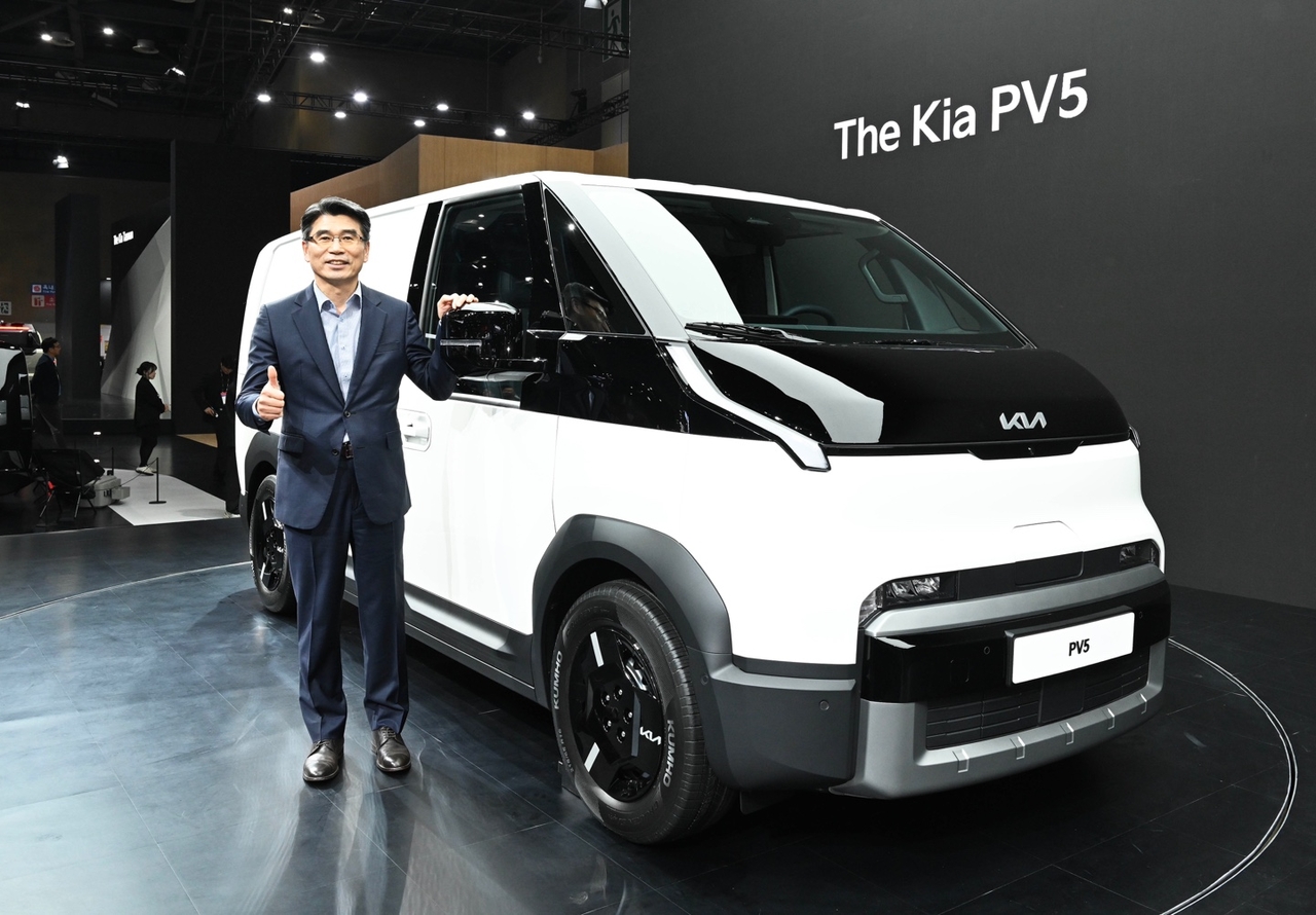 | 송호성 기아 사장이 ‘2025 서울모빌리티쇼’ 언론공개 행사에서 PV5와 기념사진을 촬영하고 있다. [기아 제공] |