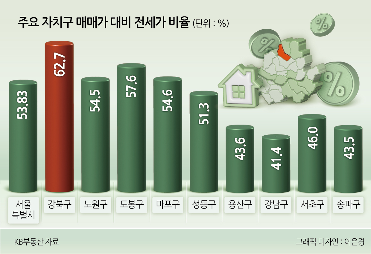 [헤럴드경제=홍승희 기자] 서울에서 아파트 매매가 대비 전세가 비율이 가장 높은 자치구는 강북구인 것으로 집계됐다. 이에 강북구 미아동이 새로운 ‘갭투자’의 성지로 떠오르고 있다. 특히 지난 2022년 최고가 대비 2억원 가량 떨어진 가격을 유지하고 있어 신혼부부들에게도 접근성이 좋다는 평가가 나온다. 헤럴드경제 부동산360은 미아동에 자리한 ‘가성비 아파트’ 주요 단지를 돌아봤다.