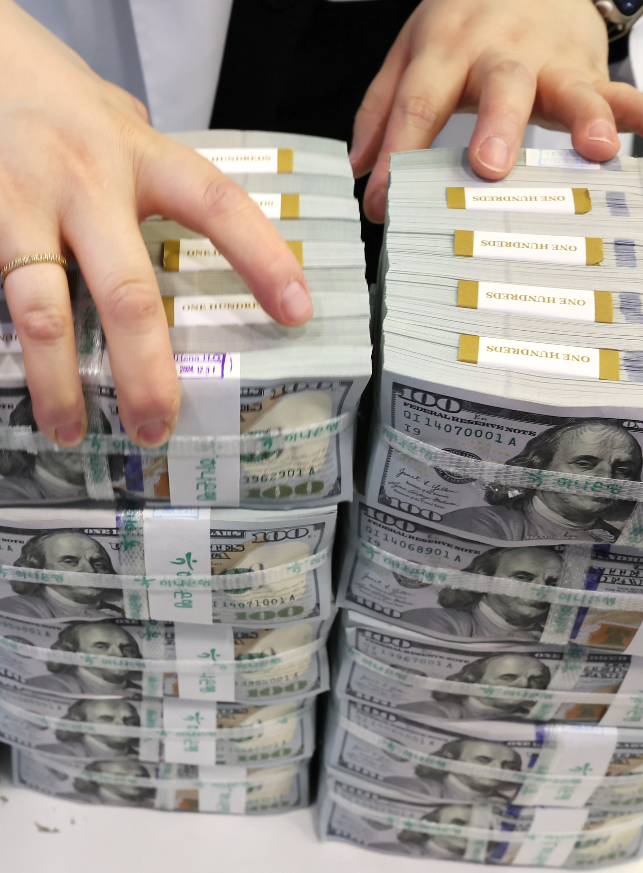 | 우리나라 외환보유액이 증가세로 돌아섰지만, 분기말 요인이 상당해 3월 동월 기준으로 비교하면 5년 이내 최저로 나타났다. 사진은 지난달 31일 서울 중구 하나은행 위변조 대응센터에서 직원이 미국 달러를 정리하는 모습 [연합] |