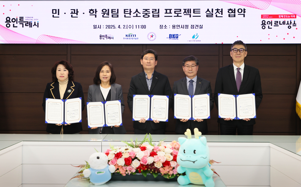 [헤럴드경제(용인)=박정규 기자]용인특례시(시장 이상일)는 2일 시장 접견실에서 한국환경산업기술원, 용인교육지원청, 단국대, (사)용인시어린이집연합회와 ‘민·관·학+ 원팀 탄소중립 프로젝트 실천 협약’을 체결했다고 밝혔다.