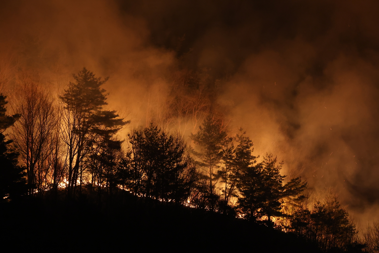| 지난달 27일 경남 산청군 시천면 야산에서 산불이 확산되고 있는 모습. [연합] |