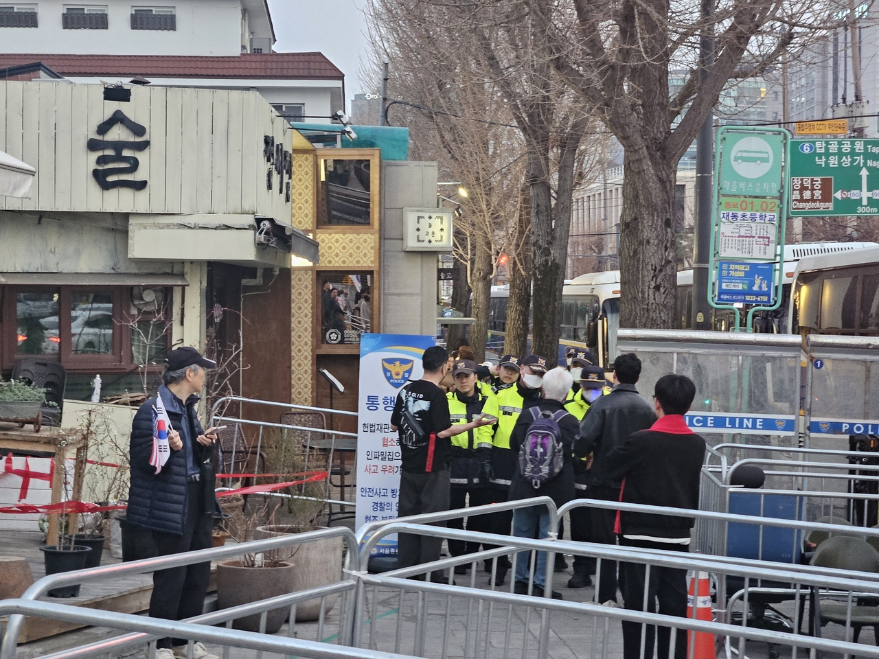 | 24일 오후 서울 종로구 헌법재판소 앞 도로에서 탄핵반대 시위자들의 통행을 통제하고 있는 경찰들의 모습이 보인다. 이용경 기자 |