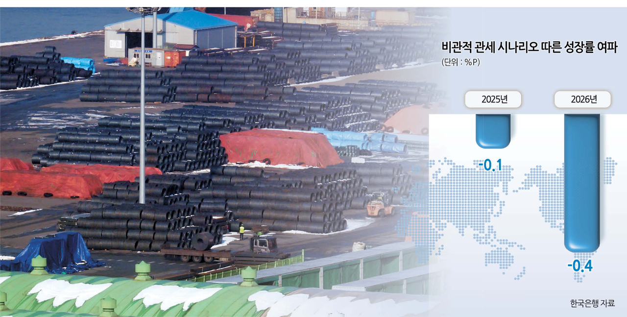 | 미국의 관세 부과로 한국 경제 성장률이 기존 비관적 전망보다 더 떨어진 1%초반이 될 수 있다는 우려가 나오고 있다. 사진은 경기도 평택항에 쌓여 있는 철강 제품 [헤럴드DB] |