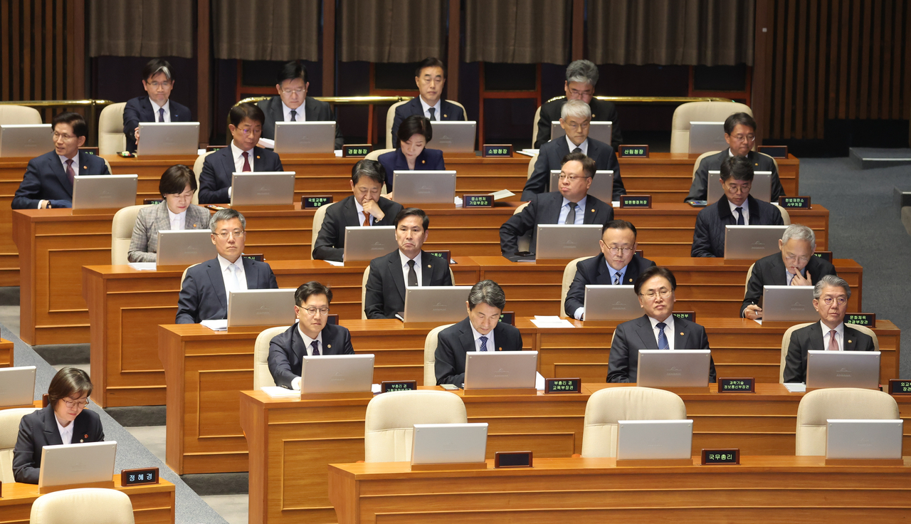 | 3일 국회 본회의에서 진행된 ‘경북·경남·울산지역 산불 사태 수습과 피해대책 마련 및 헌법질서 수호를 위한 긴급현안질문’에 불출석한 한덕수 대통령 권한대행 국무총리의 자리가 비어 있다. [연합] |