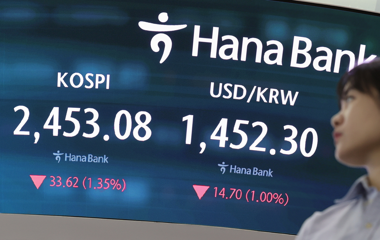이날 오후 1시 52분 코스피 지수는 전장보다 43.34포인트(1.74%) 내린 2443.36이다.