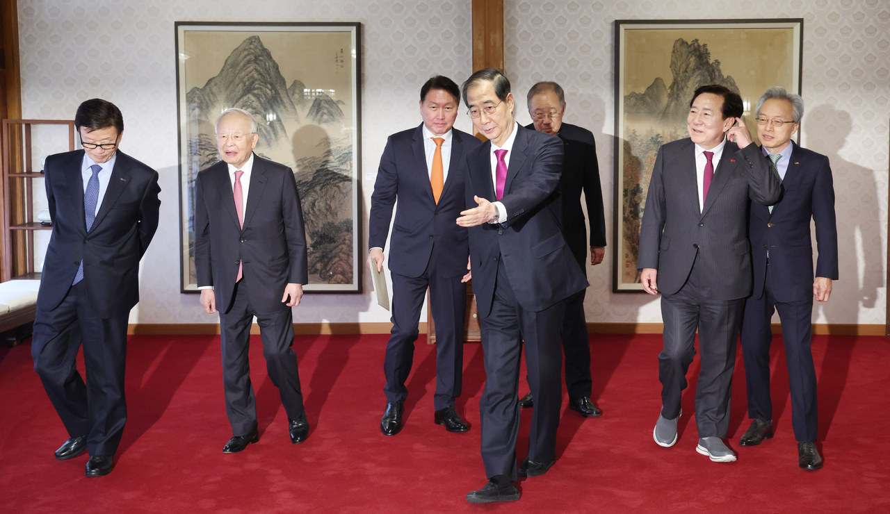 | 한덕수 대통령 권한대행 국무총리가 지난달 27일 서울 종로구 총리공관에서 경제6단체장과 간담회에 앞서 기념촬영을 마친 뒤 자리로 이동하는 모습. 왼쪽부터 윤진식 한국무역협회장, 손경식 한국경영자총협회 회장, 최태원 대한상공회의소 회장, 한 권한대행, 류진 한국경제인협회 회장, 김기문 중소기업중앙회 회장, 최진식 한국중견기업연합회 회장 [연합] |