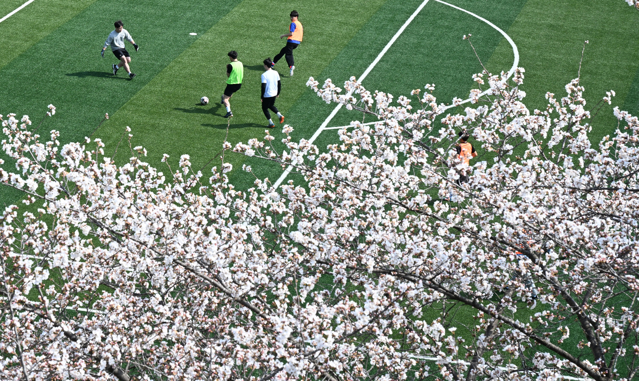 | 벚꽃이 꽃망울을 터트린 3일 경남 거창군 경남도립거창대학 체육대회에서 학생들이 축구 경기를 하고 있다. [경남 거창군 제공] |