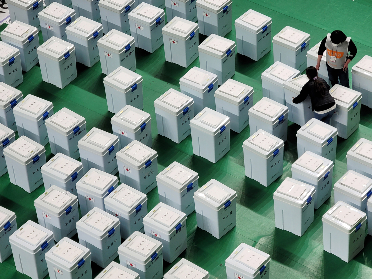 | 윤석열 대통령이 4일 파면되면서 60일간의 조기대선 레이스가 동시에 시작됐다. 늦어도 6월 3일 이전에 대선이 치러지게 된다. 사진은 직전 제20대 대통령선거일인 2022년 3월 9일 투표소에서 개표사무원들이 투표함을 옮기고 있는 모습 [연합] |