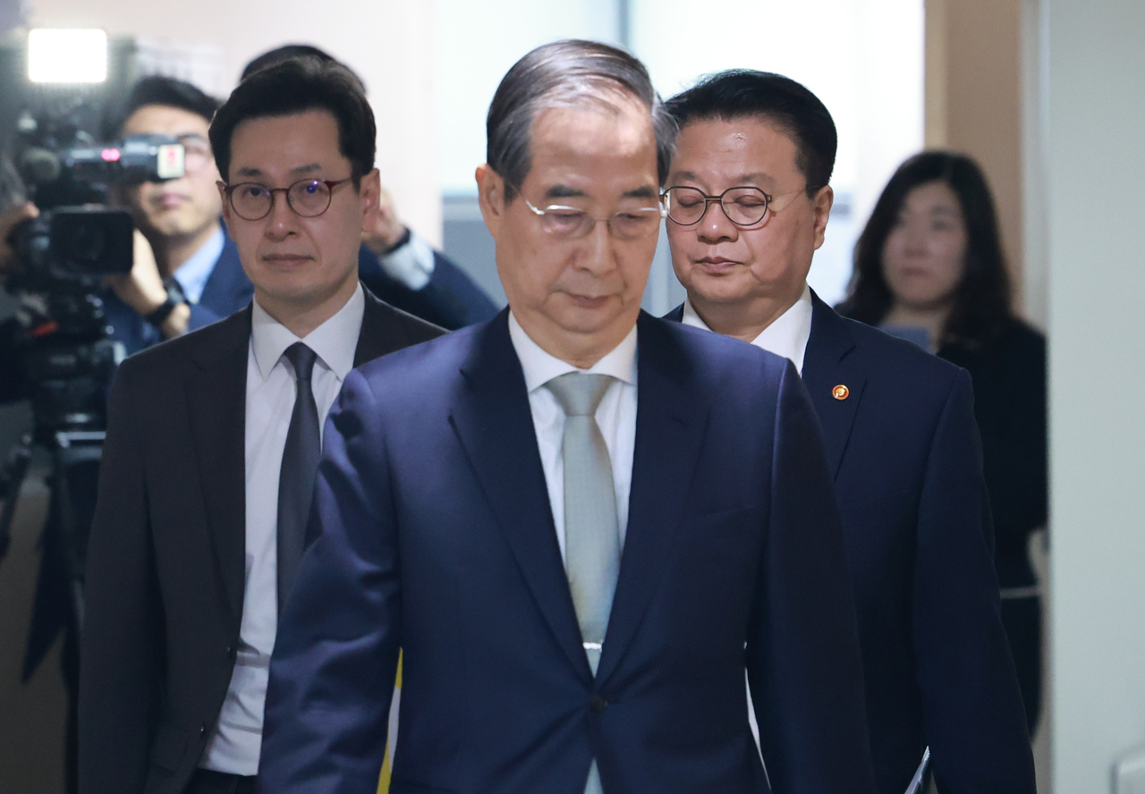 | 한덕수 대통령 권한대행 국무총리가 4일 정부서울청사에서 헌법재판소의 윤석열 대통령 파면 선고 뒤 대국민 담화를 하기 위해 브리핑실에 입장하고 있다.[연합] |