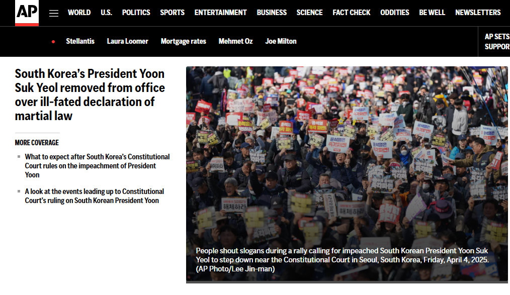 AP 통신 역시 이날 오전 11시 27분 “한국 헌법재판소가 재판관 전원일치로 윤석열 대통령을 파면한다”는 판결을 내렸다는 내용을 속보로 다뤘다.