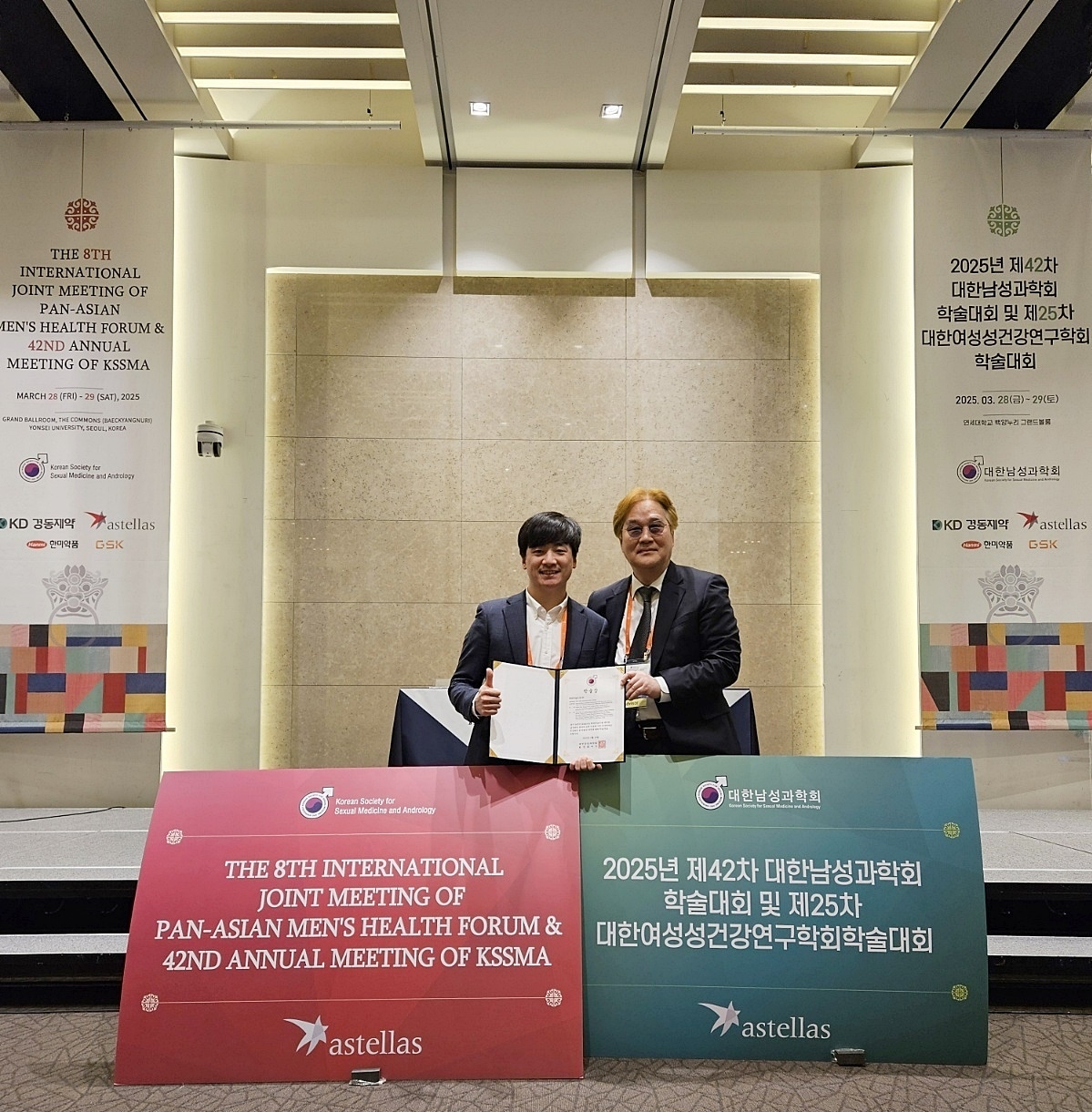 | 서울성모병원 비뇨의학과의 김세웅(오른쪽)·신동호 교수가 대한남성과학회 정기학술대회에서 해외학술상을 수상한 뒤 기념촬영을 하고 있다. [KGC인삼공사 제공] |