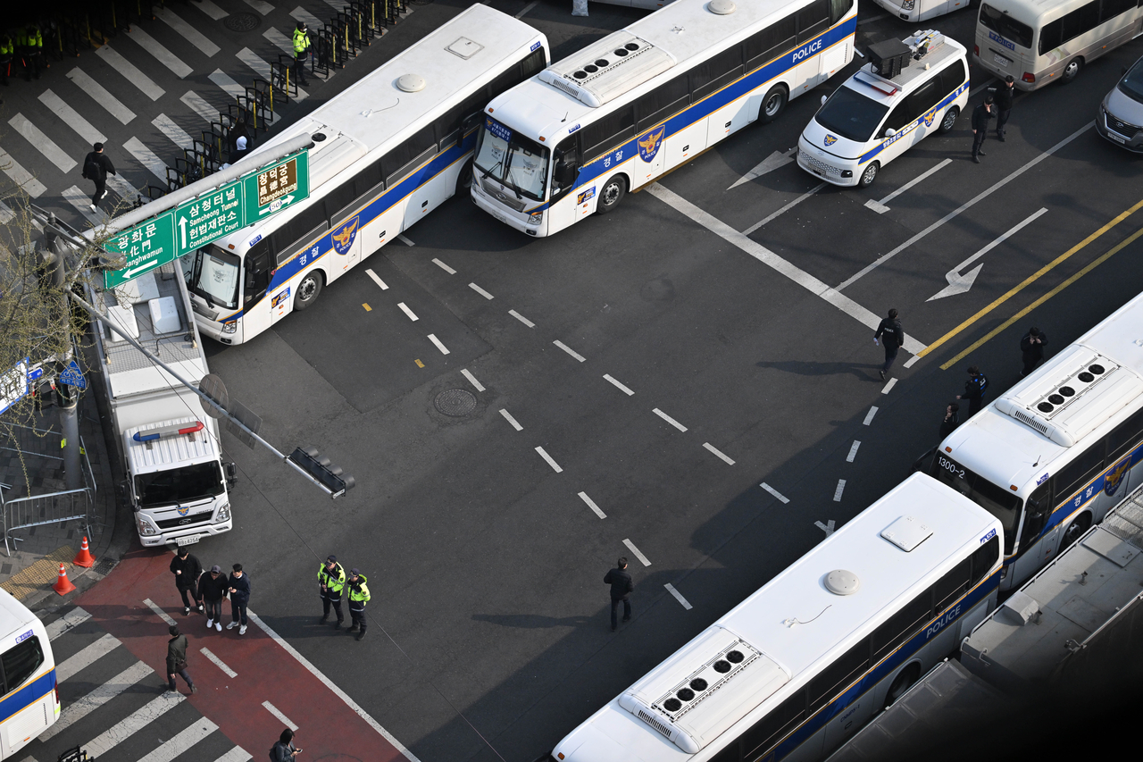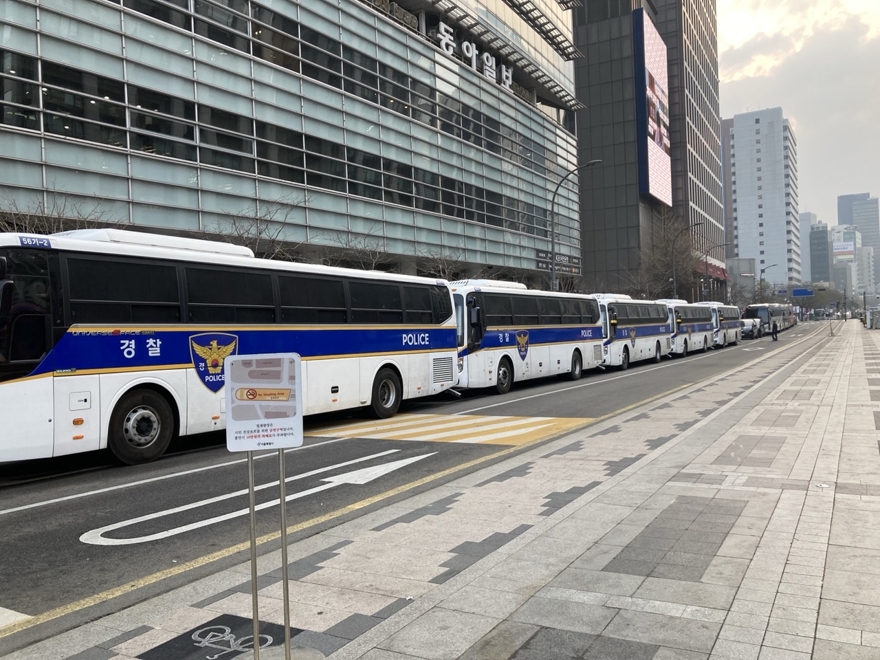 | 윤석열 대통령 탄핵 심판 선고기일이었던 4일 오전 서울 종로구 헌법재판소 인근 안국역사거리에 경찰버스가 차벽을 이루고 있다. 임세준 기자 |
