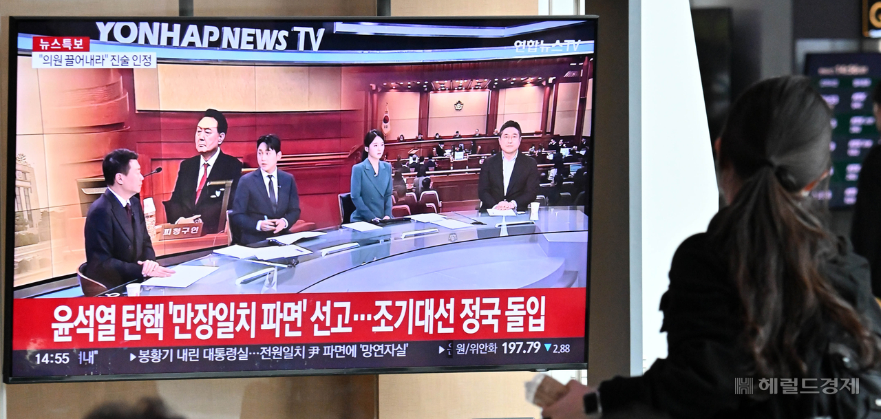 | 헌법재판소가 윤석열 대통령을 지난 4일 파면했다. 헌재는 국회의 탄핵소추 사유 5개를 모두 인정 하며 재판관 전원일치 의견으로 인용했다. 파면의 효력은 즉시 발생해 이를 기점으로 윤 대통령은 직위를 잃었다. 이날 오후 서울 용산구 서울역 대합실에 윤 대통령 선고 관련 뉴스가 송출되고 있다. 임세준 기자 |