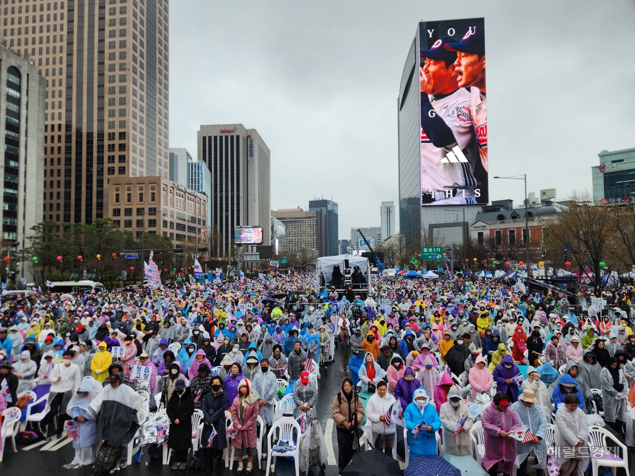 | 5일 서울 종로구 동화면세점 앞에서 대한민국바로세우기국민운동본부 주최 광화문 국민대회가 열리고 있다. [연합] |