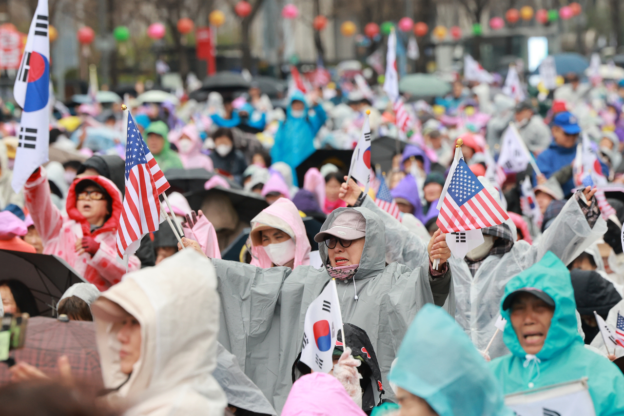 이날 집회 현장에는 우산을 들고 비옷을 입고 모인 지지자들이 모여들었다. 지지자들은 “사기탄핵 철회하라” 구호를 연신 외쳐댔다. 이들의 손에는 여전히 태극기·성조기가 쥐어져 있었다.