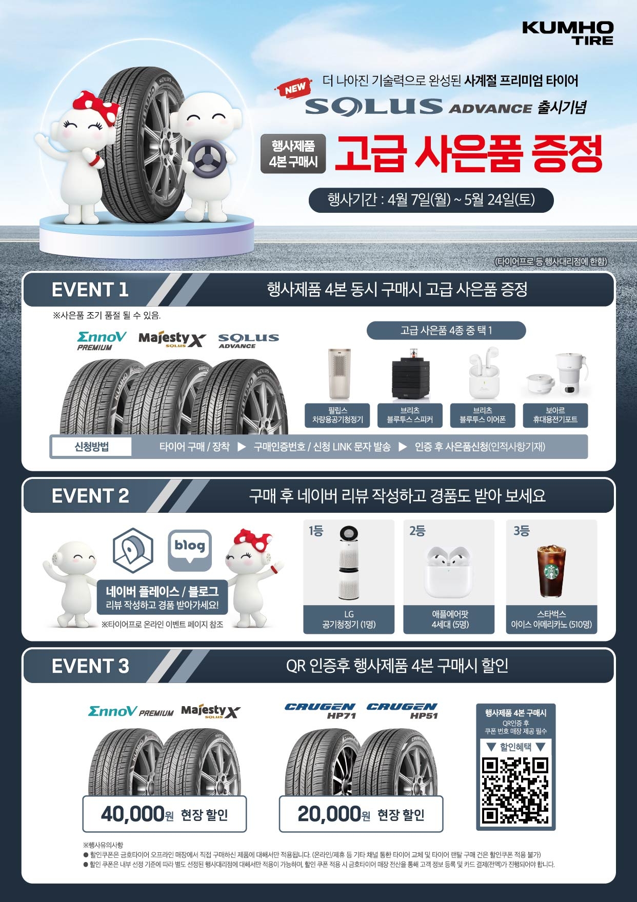 [헤럴드경제=김성우 기자] 금호타이어(대표 정일택)가 신제품 ‘솔루스 어드밴스(SOLUS ADVANCE)’ 출시를 기념하여 다음달 24일까지 이벤트를 실시한다.