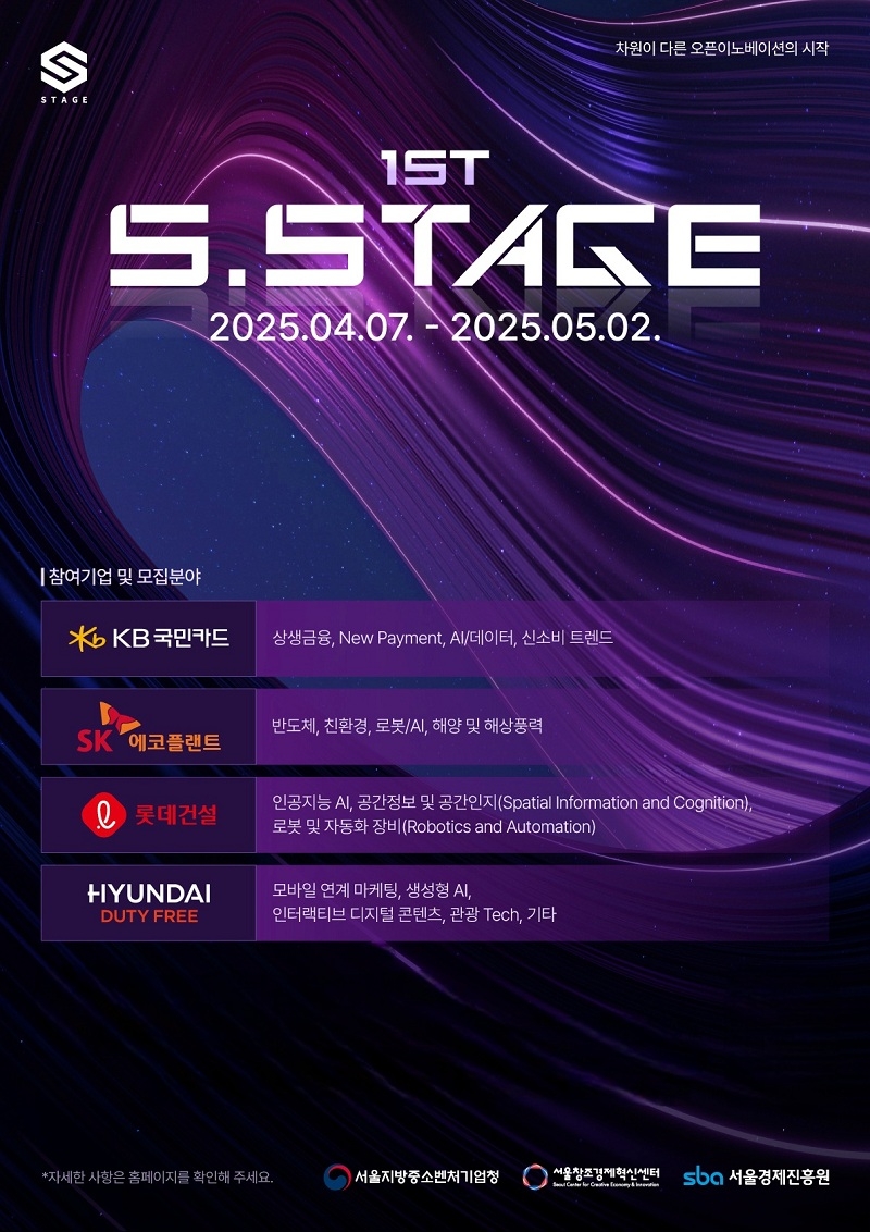 서울창조경제혁신센터(대표이사 이영근)는 KB국민카드, SK에코플랜트, 롯데건설, 현대면세점과 함께 서울센터의 새 오픈이노베이션 프로그램인 ‘2025 1st S.Stage’를 개최한다고 밝혔다. 이번 프로그램은 대기업과 스타트업 간 협력을 촉진하는 오픈이노베이션 2.0 사업의 일환으로, 발굴부터 투자까지 원스톱으로 지원하는 것이 특징이다.