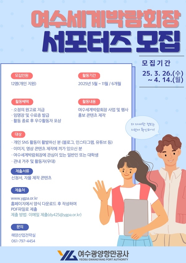 [헤럴드경제(여수)=신건호 기자] 여수광양항만공사(사장 박성현, YGPA)가 여수세계박람회장 사업 및 행사 홍보를 위해 제2기 서포터즈를 모집한다.