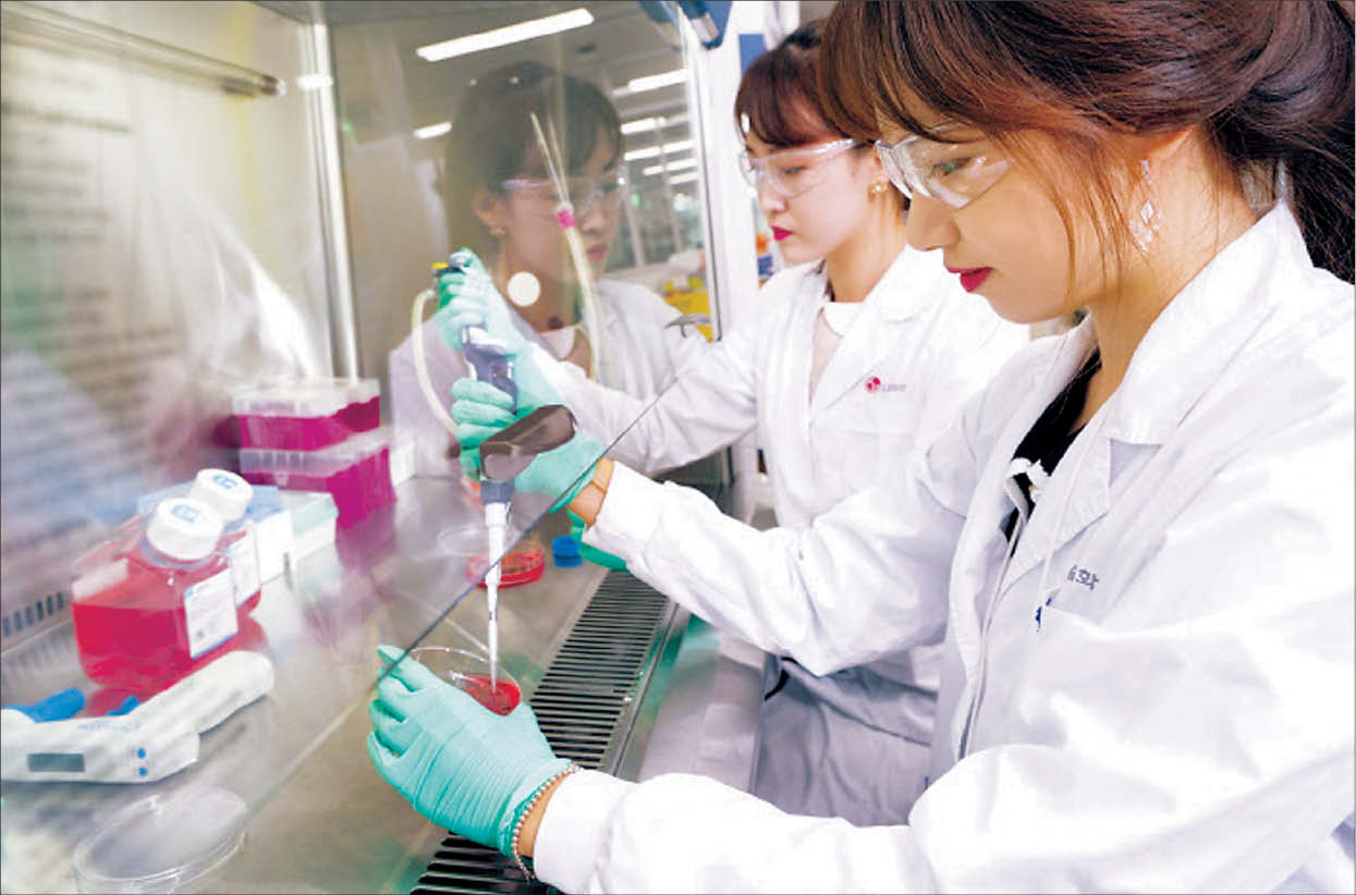 | 신약 개발은 평균 3조원 이상의 돈을 투입해야 하지만, 성공만 하면 해당 기업은 세계적 기업으로 거듭날 수 있다. 신약 개발에 몰두하고 있는 LG화학 연구진 [LG화학 제공] |