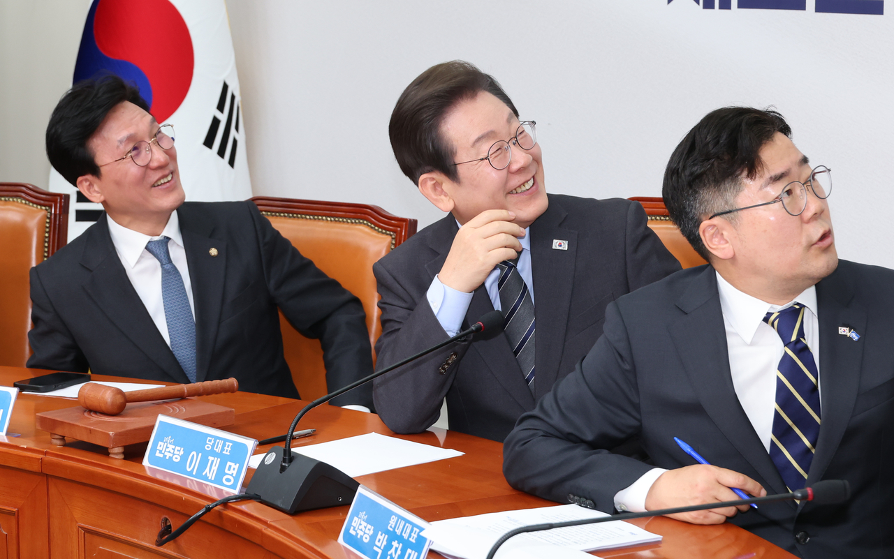 | 더불어민주당 이재명 대표가 7일 서울 여의도 국회에서 열린 최고위원회의에서 한준호 최고위원이 공개한 홍준표 대구시장의 “탄핵 당한 당은 차기대선 포기해야 한다” 발언이 담긴 영상을 보며 활짝 웃고 있다. 연합뉴스 |
