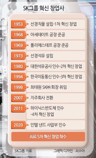 ▶5차 혁신창업 준비…AI로 새 패러다임 겨냥=SK는 삼각파도를 마주한 현 상황에서 현재 다섯 번째 혁신을 준비하고 있다. 최 회장은 지금 상황에 대해 “지금까지 씨름을 잘해왔던 선수라도 수영에서 경쟁하면 어려움을 겪을 수밖에 없다”며 ‘씨름선수에서 수영선수로의 전환’ 또는 ‘물 속에서 씨름을 하도록 (룰을) 바꿀 수 있는 목소리를 키우는 것’이 필요하다고 강조한다. 기존 경제질서가 완전히 바뀌며 전혀 다른 세상을 마주하고 있다는 점을 표현한 것이다.