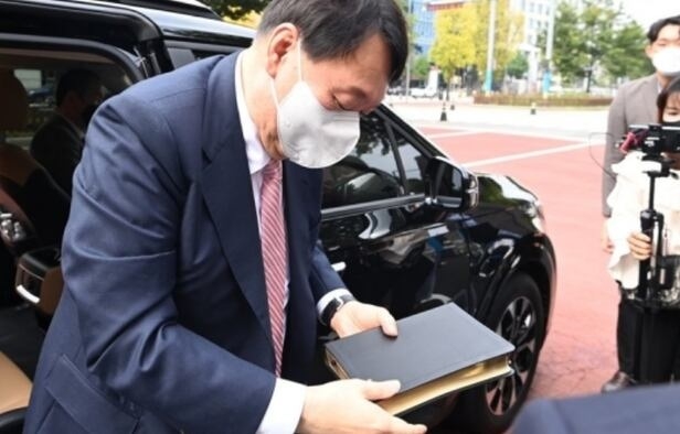 | 국민의힘 대선 주자인 윤석열 전 검찰총장이 10일 오전 서울 여의도 순복음교회 예배에 참석하기 위해 성경책을 들고 차에서 내리고 있다. [국회사진기자단] |