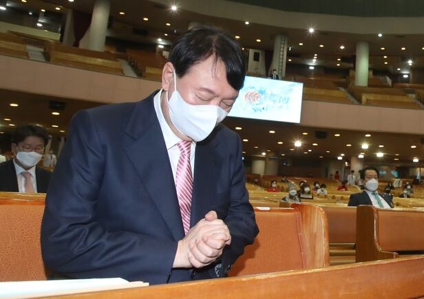 | 국민의힘 윤석열 대선 경선 예비후보가 2021년 10월 10일 오전 서울 여의도 순복음교회 본당을 찾아 예배에 앞서 기도하고 있다. [국회사진기자단] |