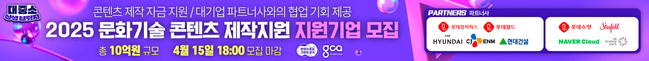 이번 사업은 ‘대기업 협업형’과 ‘자유형’ 과제로 나뉘어 진행된다. 특히 대기업 협업형은 콘텐츠 산업 분야의 주요 파트너사와 함께 과제를 수행하는 구조로, 중소기업이 실질적인 협업을 통해 비즈니스 기회를 확대할 수 있도록 마련됐다. 올해 협업에 참여하는 대기업은 ▷롯데컬처웍스▷호텔롯데 롯데월드 ▷CJ ENM ▷현대백화점 ▷현대건설 등 총 5개사다. 이외에도 후속 협력 네트워크를 형성할 4개 대기업 파트너사도 함께한다.