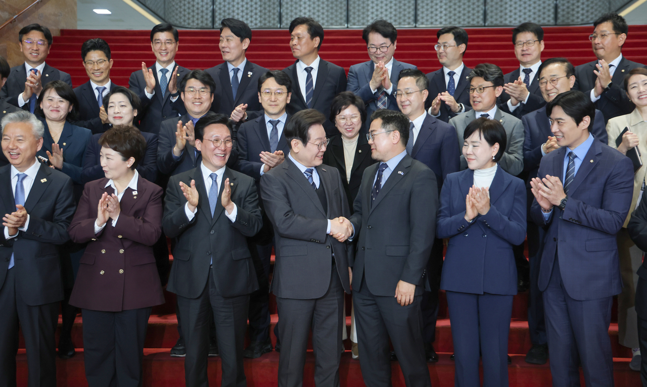 | 이재명(앞줄 왼쪽 네 번째) 전 더불어민주당 대표가 9일 서울 여의도 국회에서 대표직 사퇴 후 최고위원 등 당 관계자들과 기념 촬영하며 박찬대 원내대표와 악수하고 있다. [연합] |