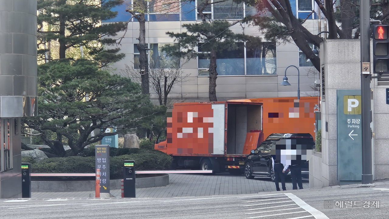 | 이날 오전 윤 전 대통령의 사저인 아크로비스타 정문에는 이삿짐 트럭이 들어가는 모습이 포착됐다. 박지영 기자. |